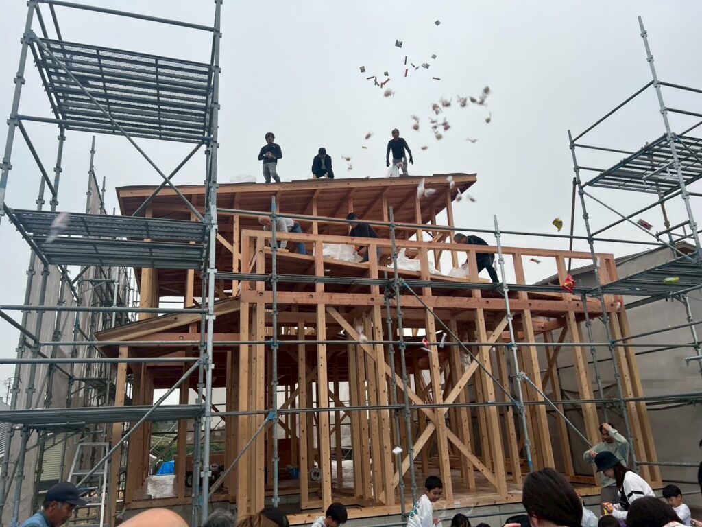 本日10月25日は天候がとても心配で棟上途中もパラパラと雨が… しかし棟上後のご近所さんへの振舞いの餅投げになると奇跡的に雨も上がり、ブルーシートを引き詰めて安全を確保して無事に餅投げが出来ました… 当社も久しぶりの餅投げの現場となりました…