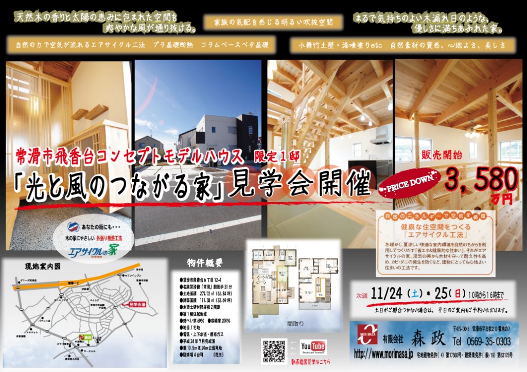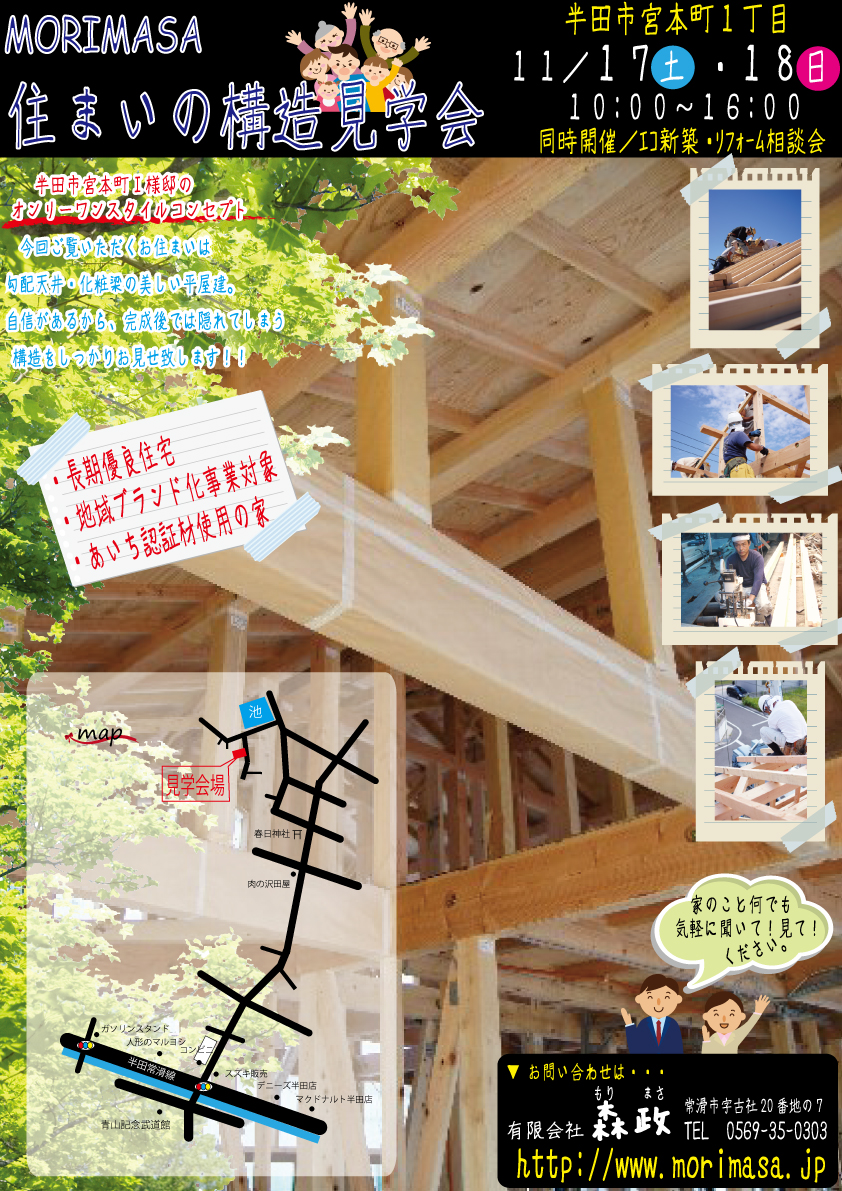 これが意外に大変なんですが… 最近では、嫁も作成できるようになり、いつもレイアウトで、意見が合わない状態ですが、いろいろな加工は、出来るようになったので進歩です(助かっております) 来週は、半田市宮本町にて、地域ブランド事業(長期優良住宅)の構造見学会です。こちらは、あいち認証材仕様の家でもあります… こちらの原稿は妻が作成しました。
