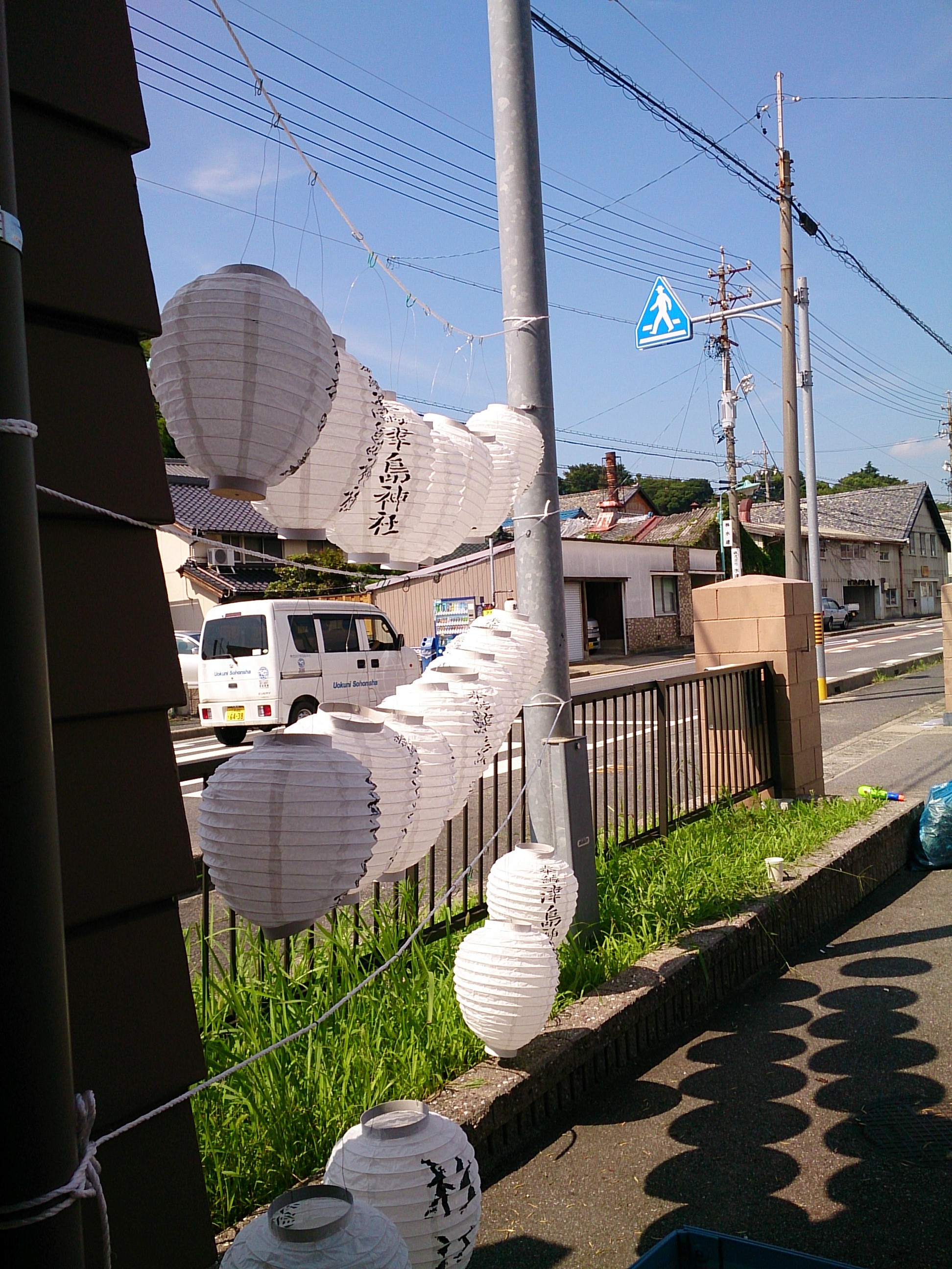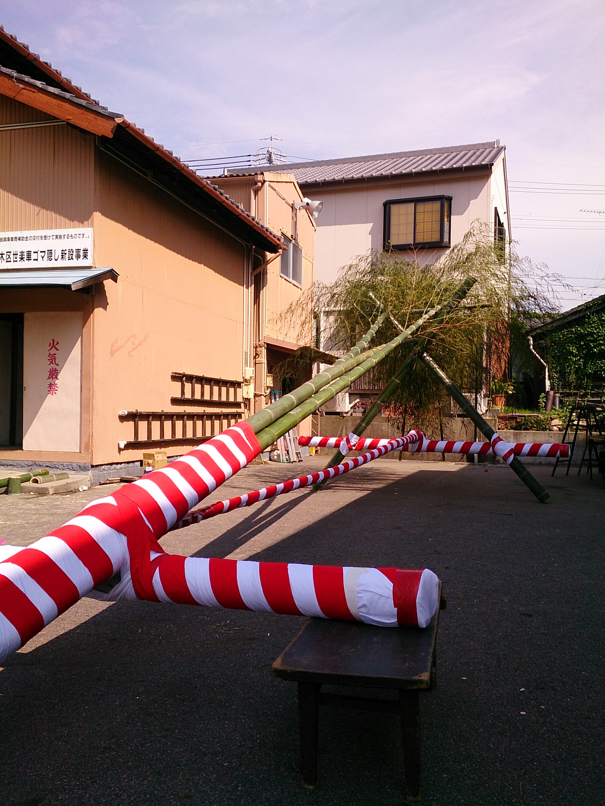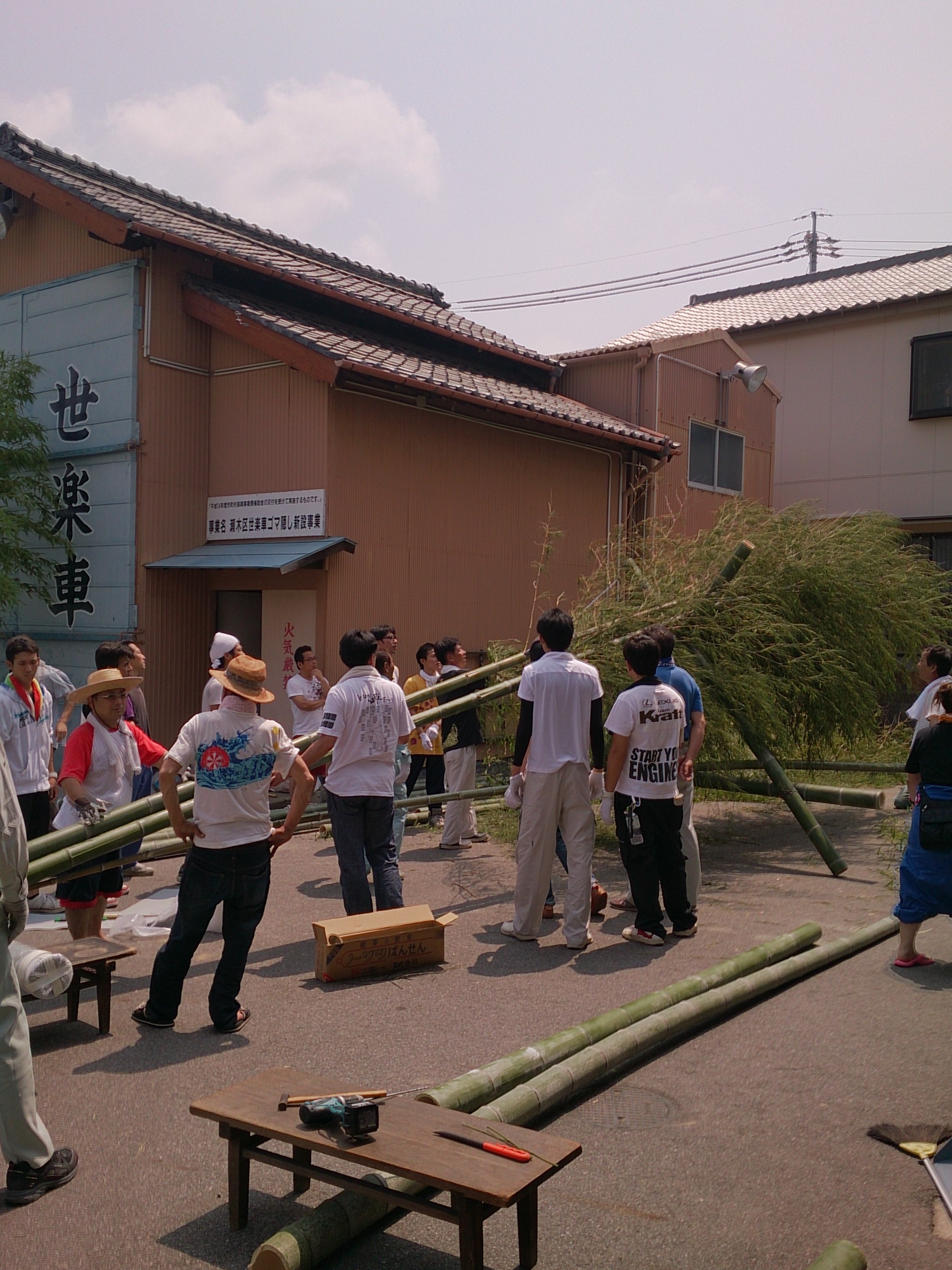 朝早くから竹を山に切りに行き午前中で組立をしたり、花火箱の飾り付けなどの準備、道中会場の提灯付けや本部設置などをして完了です。皆さん暑い中本当にご苦労様です…