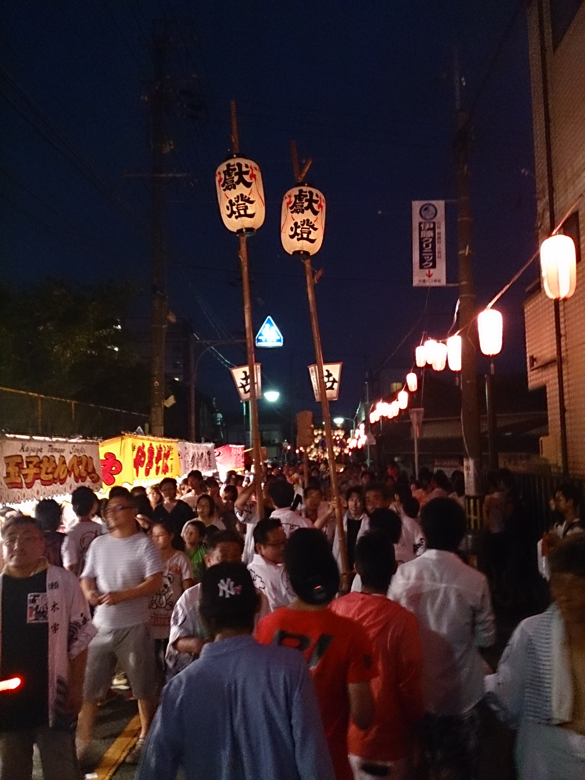 販売された提灯は、竹に取り付けて、道中を移動します… 夕方には、参加者がぞろぞろと集まってきます…
